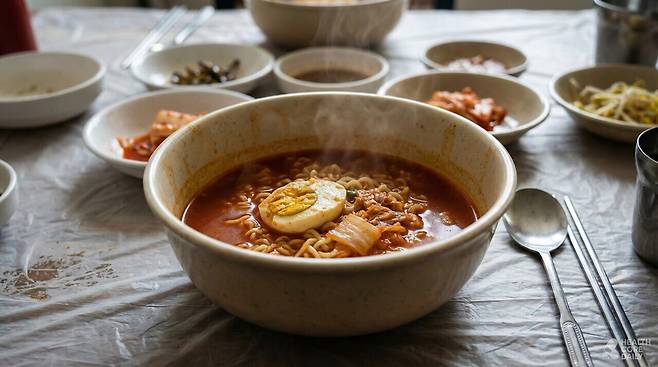 라면은 국물과 면이 동시에 작용한다. 면은 흡수가 빠른 정제 탄수화물이고 국물에는 나트륨이 집중돼 있다. 1봉 기준 열량은 약 500kcal다. 혈당 상승과 수분 균형 변화가 함께 나타나면서 췌장은 인슐린 분비와 소화 효소 조절을 동시에 맡게 된다. 짧은 시간 안에 반복 섭취되기 쉬운 점도 부담 요인이다.