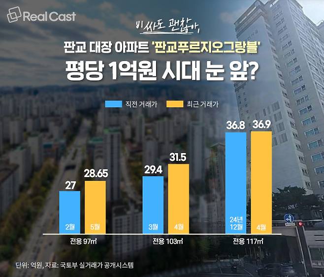 - ‘판교푸르지오그랑블’ 전용 117㎡ 36억9,000만원에 팔려