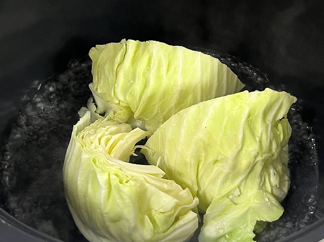 양배추 양이 많은 경우에는 중간에 한 번 꺼내어 뒤집어 줍니다. 이렇게 하면 열이 고르게 전달되어 덜 익는 부분 없이 고르게 양배추가 익습니다.