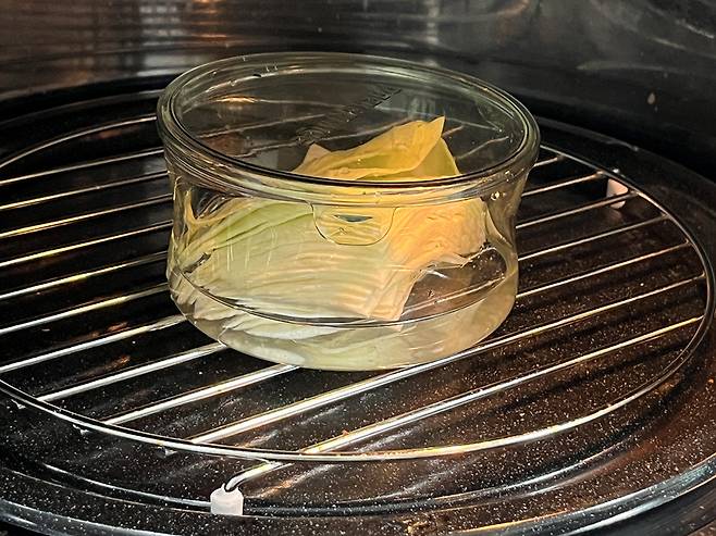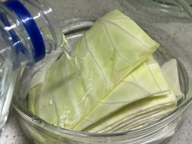 전자레인지 가능 용기에 양배추를 넣고 양배추가 자작하게 잠길 만큼만 물을 부어 주세요.
