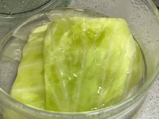 양배추 양이 많은 경우에는 중간에 한 번 꺼내어 뒤집어 줍니다. 이렇게 하면 열이 고르게 전달되어 덜 익는 부분 없이 고르게 양배추가 익습니다.