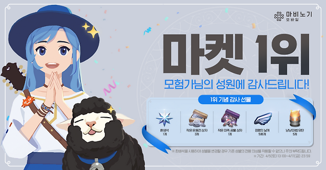마비노기 모바일은 출시 하루 만에 애플 앱스토어에서 매출 1위를 달성했고, 구글 플레이스토어에서도 인기 게임 1위에 오른 바 있다. 넥슨은 이러한 유저들의 관심과 응원에 보답하기 위해 '마켓 1위 기념 감사 선물'을 준비했으며, 이벤트 기간 내에 접속하는 것만으로도 선물을 받을 수 있다고 전했다.