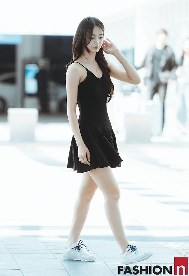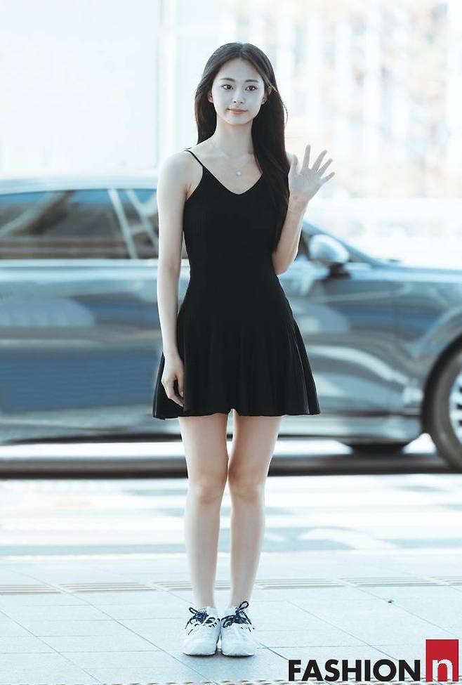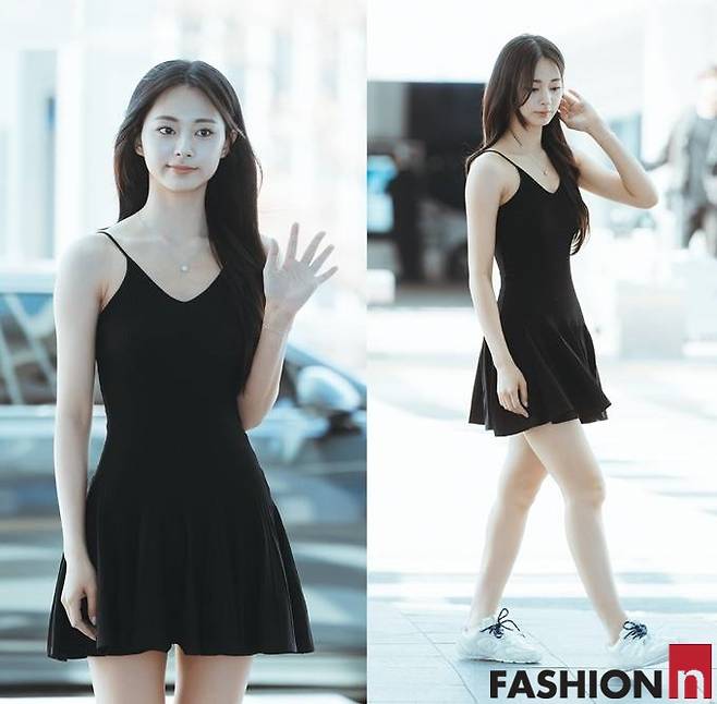이날 쯔위는 블랙 탱크탑 원피스룩으로 계절 앞서가는 한여름 공항패션으로 시선을 사로잡았다.