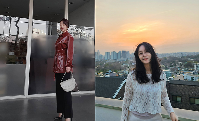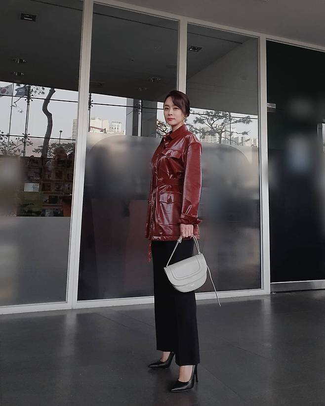 두 번째 사진에서는 와인 컬러의 레더 재킷으로 도시적인 감각을 강조했다. 허리를 강조하는 벨트 디테일이 여성스러움을 부각시키며, 블랙 팬츠와 스틸레토 힐로 모던한 실루엣을 완성했다. 여기에 화이트 핸드백을 매치해 전체적인 룩에 밝은 포인트를 더했다. 세련된 도심 속 스타일링의 좋은 예라 할 수 있다.