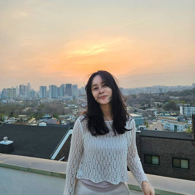 세 번째 사진에서 우희진은 크림색 니트 톱을 착용해 부드럽고 로맨틱한 무드를 연출했다. 루프 형태의 니트 패턴이 독특하면서도 우아한 분위기를 자아내며, 배경의 노을과 어우러져 따뜻하고 감성적인 느낌을 준다. 자연스러운 헤어스타일과도 잘 어울리는 편안한 데일리룩이다.
