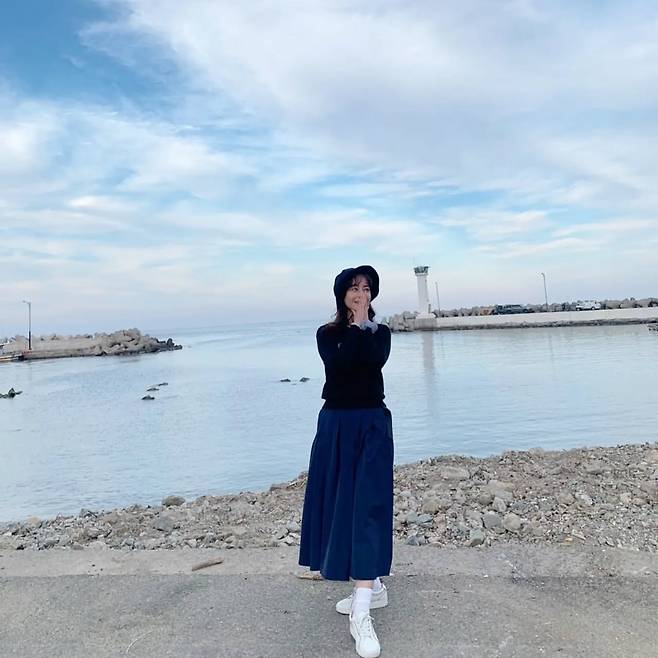 네 번째 사진에서는 네이비 컬러의 롱 스커트와 블랙 니트를 매치해 클래식하면서도 단정한 스타일을 선보였다. 여기에 화이트 스니커즈를 더해 활동성을 강조하며, 모자 액세서리로 포인트를 주었다. 바다를 배경으로 한 이 룩은 깔끔하고 차분한 매력을 돋보이게 한다.