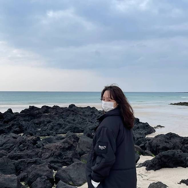 첫 번째 사진에서 우희진은 검은색 아우터를 착용하여 차분하고 자연스러운 분위기를 연출했다. 바다와 검은 현무암이 어우러진 배경과 조화를 이루는 이 스타일은 실용적이면서도 세련된 느낌을 준다. 아우터의 로고 디테일이 캐주얼한 무드를 더하며, 편안한 여행 패션의 정석을 보여준다.