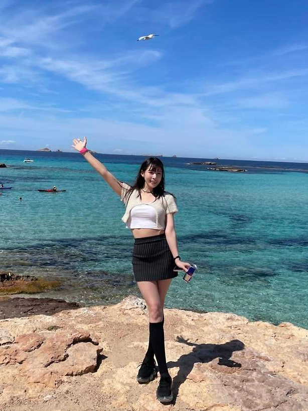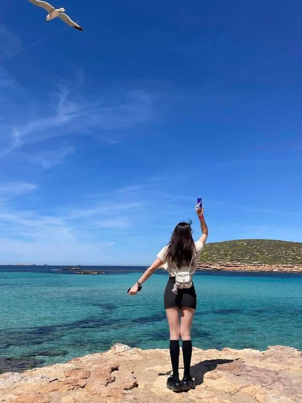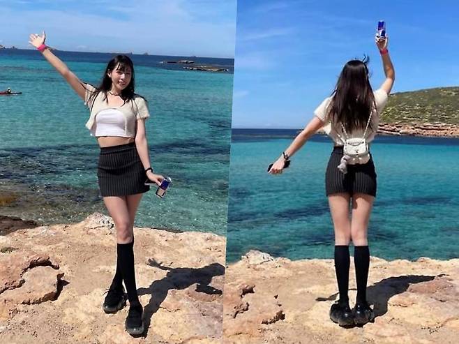 장난기 어린 포즈를 취한 신수지는 청량한 하늘과 바다, 그리고 조각 같은 실루엣으로 마치 여름 화보 속 한 장면을 연출했습니다.