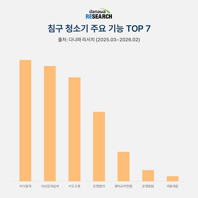 침구 청소기의 청소 퀄리티에 영향을 미치는 주요 기능을 살펴보면 바닥롤러 기능이 가장 높은 점유율을 기록하고 있다.