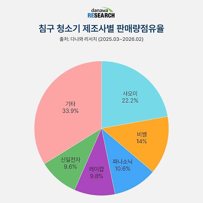 그 중에서 22.2%로 1위를 기록하고 있는 샤오미는 국내 시장에서 앞서는 인지도와 10만 원 이하의 가성비 전략, 미니멀한 화이트 톤 디자인으로 가장 인기가 많다. 14% 점유율을 보이는 비쎌은 고온 스팀이 가능한 프리미엄 거치형 침구 청소기를 전개하며 위생이 중요한 소비자를 공략하고 있다.
