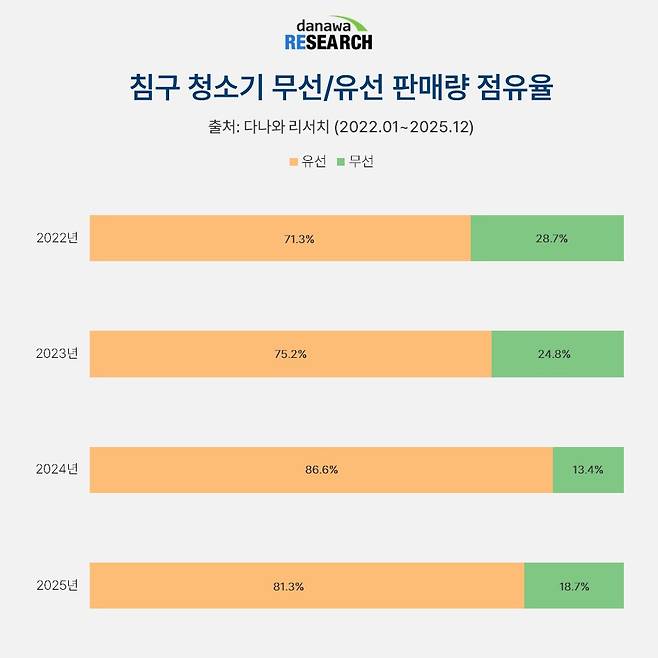 일반 스틱형 청소기의 경우 유선보다 무선 제품 비율이 높지만, 침구 청소기는 다르다. 2022년 유선 제품의 비중이 71.2%였는데, 2025년 81.3%로 10% 더 상승했다. 여전히 유선 침구 청소기가 힘을 발휘하는 원동력은 일반 스틱형 청소기와 다른 침구 청소기의 특성에 있다.
