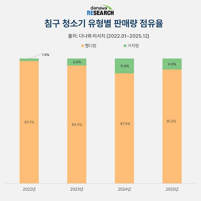 침구 청소기는 핸디형과 거치형으로 나뉘는데, 핸디형이 2022년부터 2025년까지 4년 연속으로 90% 이상의 압도적인 점유율을 보이고 있다. 핸디형은 모터, 먼지통, 흡입구가 하나로 되어 있어 비교적 컴팩트한 크기라 사용이 간편하다. 데일리로 가볍게 침구류 관리만 하고 싶다면 핸디형을 추천한다.