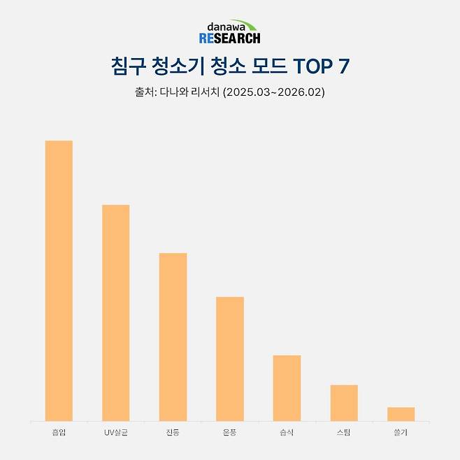침구 청소기 청소 모드별 점유율을 보면 역시 흡입 기능이 압도적이다. 흡입력 강도에 따라 침구류에 쌓인 진드기와 먼지를 제거할 수 있는 정도가 다르다. 다음으로 UV살균은 흡입구에 UV 자외선 램프를 장착해 브러쉬 접촉을 통해 살균을 할 수 있게 해주는 기능이다.