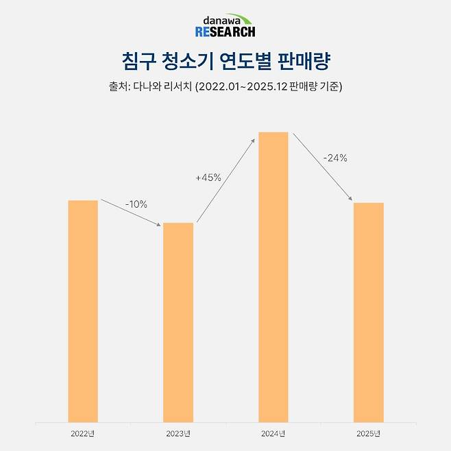 먼저, 침구 청소기의 연도별 판매량을 보자. 2024년에 전년 대비 45% 증가한 것을 제외하면 전반적으로 비슷한 수준을 유지하고 있다. 이를 통해, 침구 청소기 품목은 매년 수요가 증가하는 가전이라기보다, 특정 수요층을 중심으로 형성된 니치 시장으로 볼 수 있다.