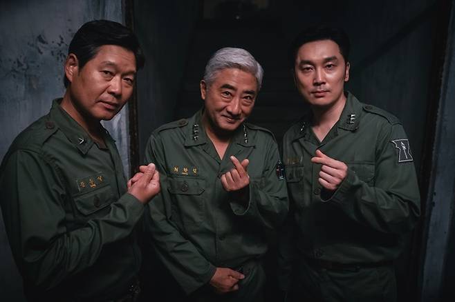 이어 군복을 입은 서현우, 유재명, 류태호는 손가락으로 하트 포즈를 취하며 극중 캐릭터와 상반된 매력을 보인다.