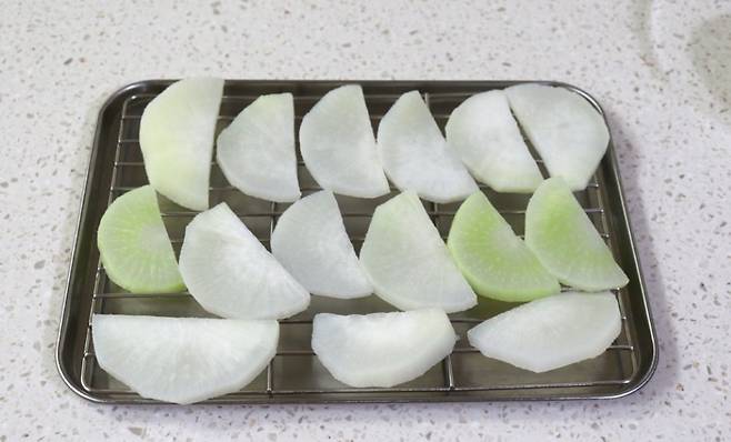 →무는 얇지 않게 채 썰어야 단맛과 식감이 살아납니다 도톰한 채소는 익히면 식감은 부드럽고, 수분감은 그대로 유지되어 먹기 좋습니다.