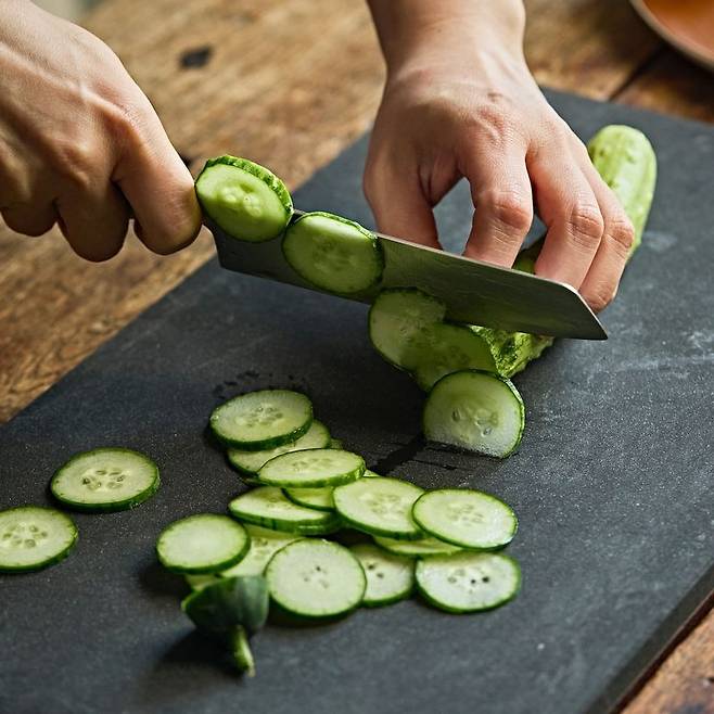 1. 씻은 오이는 모양대로 얇게 썬다.