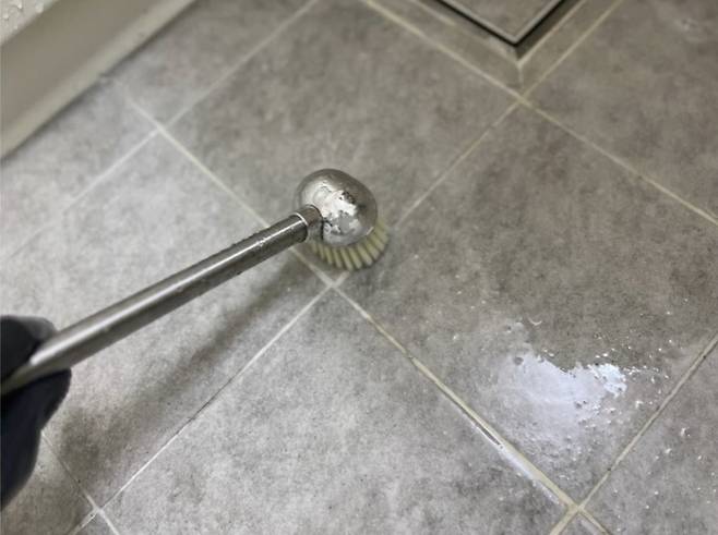 틈새는 얇은 솔이나 칫솔을 활용하면 말끔하게 지울 수 있습니다. 락스를 사용할 때는 환기는 필수!!