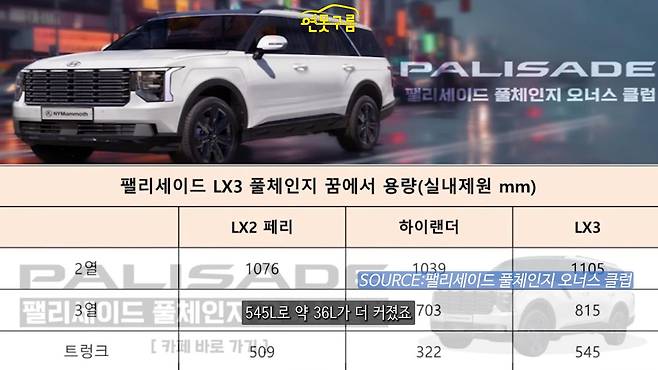 특히 2열 시트의 틸팅 기능 개선으로 공간 활용도가 높아졌다는 점도 주목할 만하다. 트렁크 적재 공간 또한 509L에서 545L로 36L 늘어나 실용성이 향상되었다. 이를 통해 팰리세이드는 기존에 우수했던 실내 공간을 더욱 개선하여 대형 SUV 시장에서의 경쟁력을 강화할 것으로 보인다.