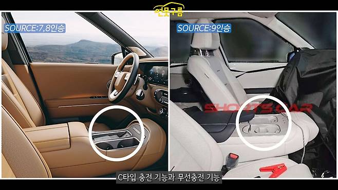 9인승 암레스트 콘솔에는 C타입 충전, 무선 충전, 컵홀더 기능이 포함되어 있다. 7/8인승은 양문형 덮개 방식의 콘솔을 사용한다.