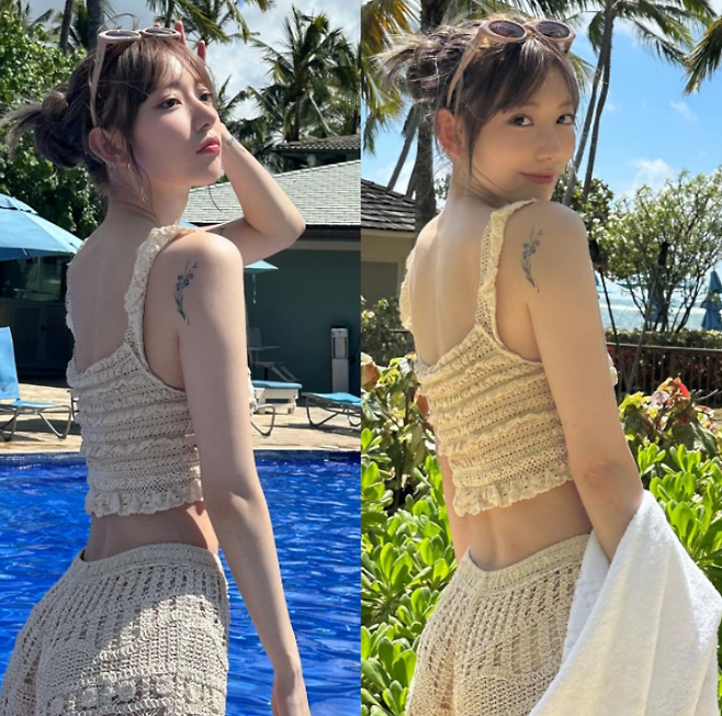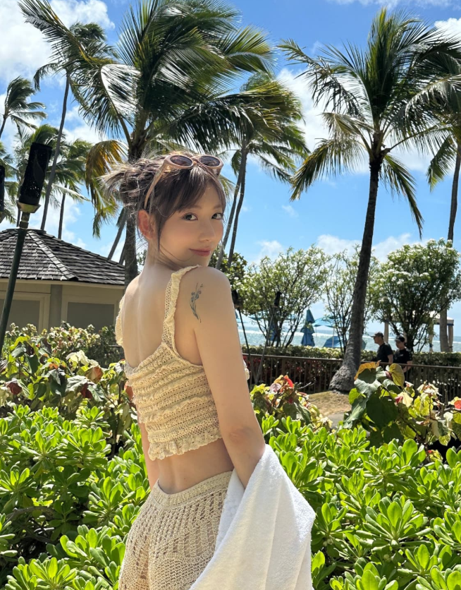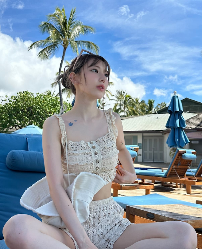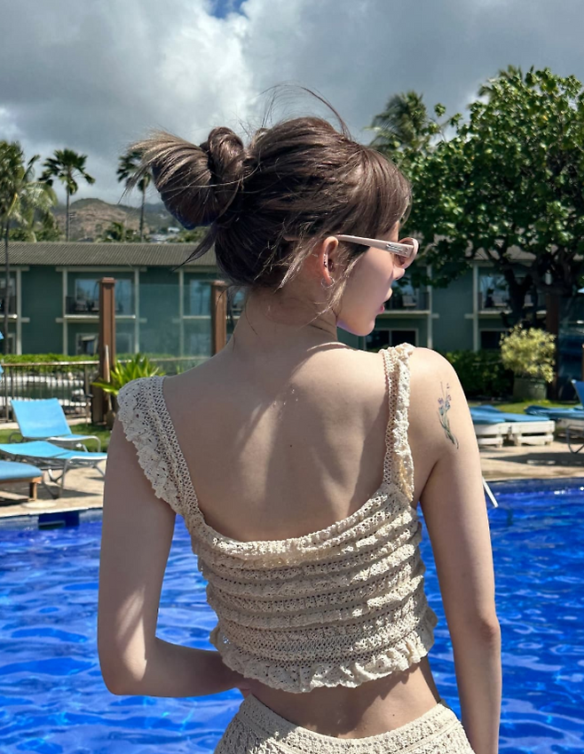 사쿠라 님은 이번에도 스타일리시한 비치룩으로 많은 팬들의 시선을 사로잡았는데요. 특히 베이지 컬러의 니트 비키니를 선택해 사랑스러우면서도 세련된 무드를 연출했어요.