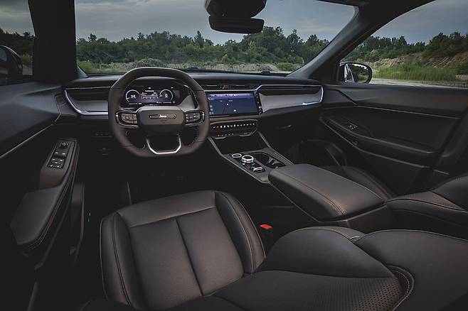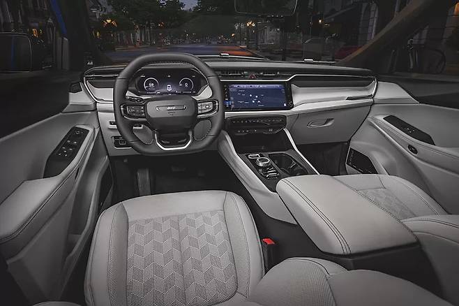 신형 체로키의 실내는 완전히 새로운 모습으로 탈바꿈했다. 운전석에는 위아래가 살짝 평평한 형태의 3 스포크 다기능 스티어링 휠이 적용되었다. 스티어링 휠 뒤로는 10.25인치 디지털 계기판이, 대시보드 중앙에는 12.3인치 유커넥트 5 터치스크린이 배치되었다. 터치스크린 아래에는 공조 시스템을 제어하는 터치식 버튼들이 자리하고 있다.