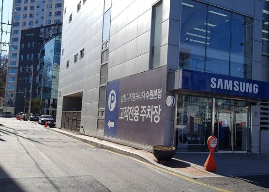 수원 시내/법원사거리 방향으로 직진 → 영통고가에서 약 500m 직진 → 삼성삼거리 좌측 삼성스토어 3층
