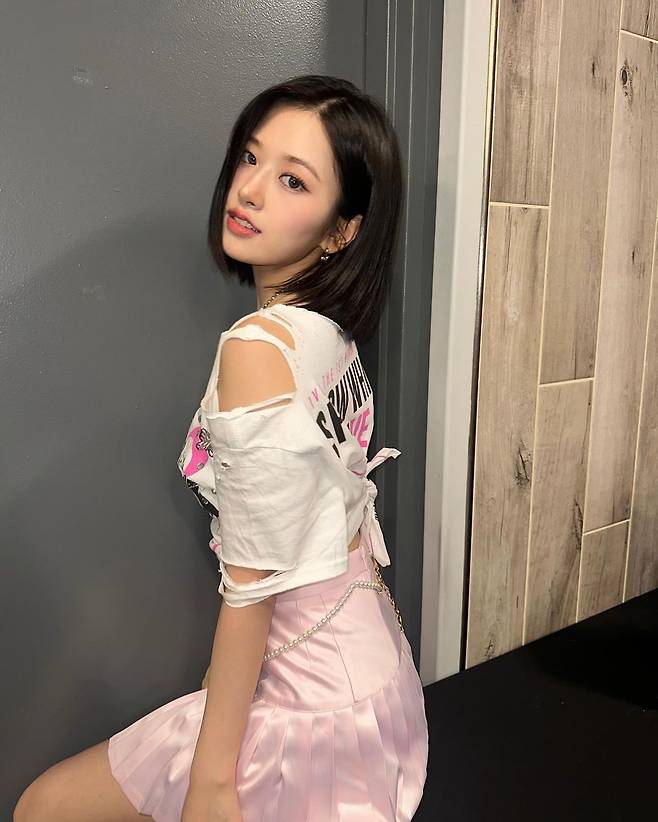 또 다른 사진에서는 어깨가 드러난 흰 크롭티를 입고 핑크 플레어 스커트를 입어 러블리한 모습을 선보였다.
