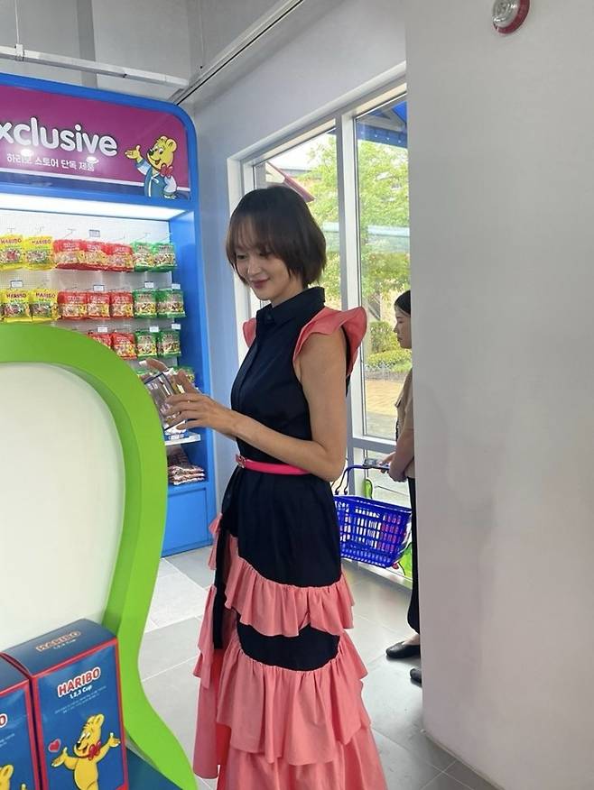 이혜정은 하리보 매장에서는 네이비와 핑크 러플 원피스에 핑크 벨트로 포인트를 주며 발랄한 분위기를 연출했습니다