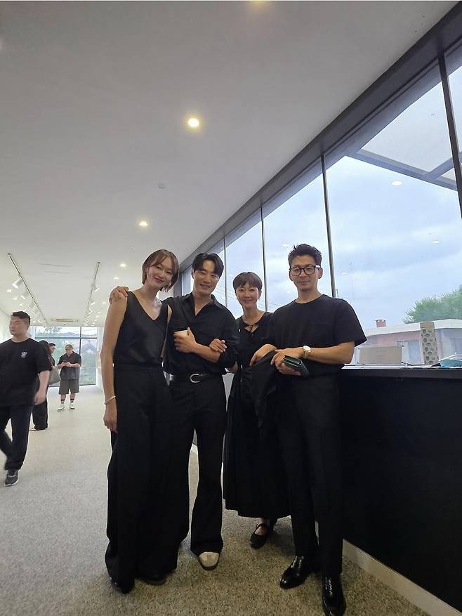 전시회장에서는 블랙 슬리브리스 톱과 와이드 팬츠로 깔끔하고 시크한 무드를 연출했으며, 운동화를 매치해 편안함과 실용성을 더했습니다.