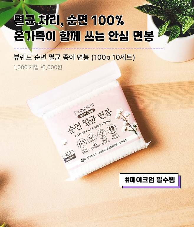 뷰렌드는 국산 브랜드라서 한 번 신뢰가 가고,100% 순면이라 두 번 신뢰가 가고,마지막으로 멸균 처리와 안전 성분들로 세 번 신뢰가 가는 아이템이지! 비건 인증까지 받은 면봉은 실제로 별로 없다고 해!