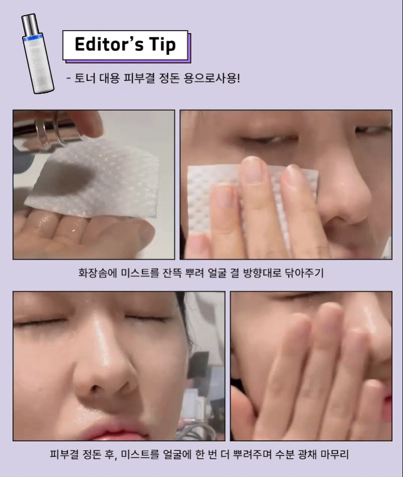 에디터가 이 미스트를 사용하는 방법을 알려줄게! 첫 번째는 토너처럼 화장솜에 적셔서 사용하는 거야. 촉촉해진 화장솜을 피부결 방향대로 발라주면 피부결 정돈과 수분 충전을 동시에 할 수 있어.