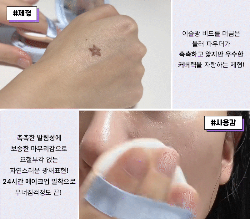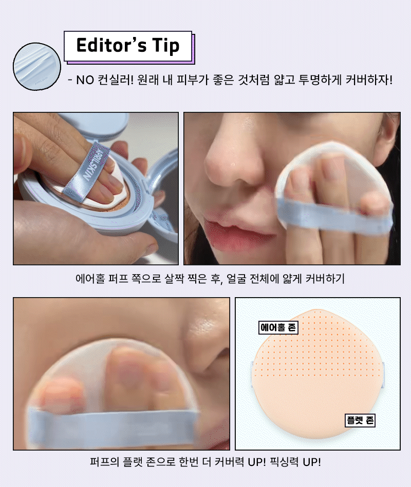 쿠션을 바를 땐 양 조절도 정말 중요해!글로잉매트쿠션 퍼프는 반반 퍼프라 구멍이 있는 에어홀 존으로 얇게 펴주고, 플랫존으로 한 번 더 커버력을 쌓아주면 얇지만 확실하게 커버해 줄 수 있어서 딱이야!