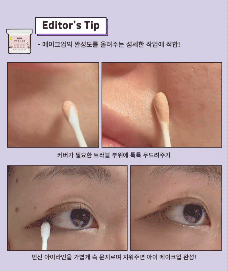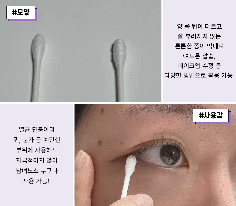 요 면봉은 메이크업할 때뿐만 아니라 귀지를 정리하거나 여드름 압출 등 다양한 용도로 활용할 수 있어! 바로 면봉의 양쪽 팁이 다르기 때문이야.