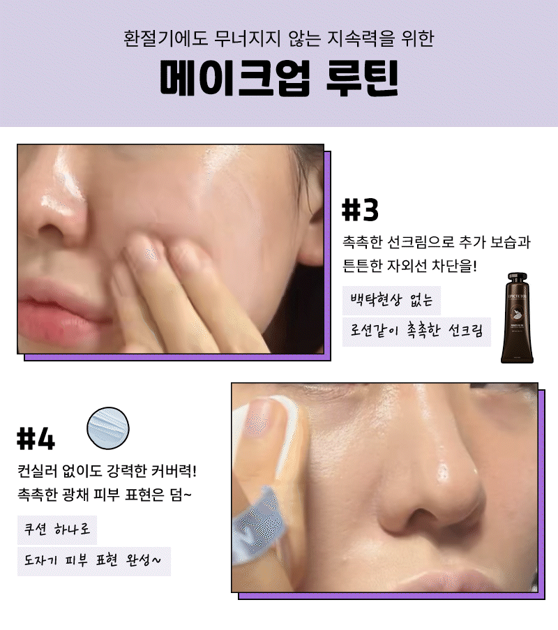 그래서 에디터는 스킨케어 단계의 수분 챙기기는 물론, 선크림과 파운데이션 단계에서도 수분을 꼭꼭 챙겨줬어. 그 덕분에 물광이 도는 메이크업을 환절기에도 할 수 있더라고!