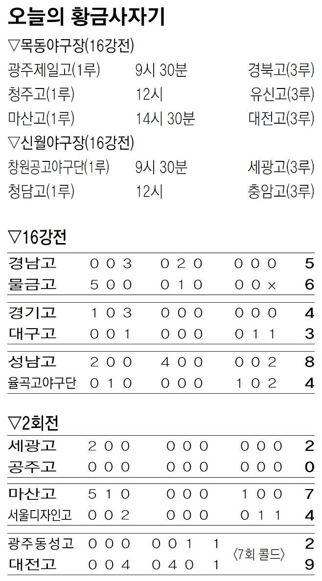 대회 전 프로 스카우트들로부터 우승 후보 1순위로 꼽혔던 대구고도 16강 문턱에서 고배를 마셨다. 대구고를 침몰시킨 팀은 1905년 창단해 국내 고교야구에서 가장 긴 역사를 자랑하는 경기고였다. 경기고 4번 타자 이동건(18)은 1회초, 3회초 연속 적시타를 치는 등 4타수 2안타 2타점으로 4-3 승리에 앞장섰다. 대구고는 9회말 이재준(18)의 희생플라이로 1점을 추가하며 한 점 차까지 추격했지만 이어진 2사 2, 3루에서 대타 양서진(18)이 3루 땅볼로 물러나면서 대회를 마무리했다. 경기고가 황금사자기 8강에 오른 건 준결승에 진출했던 2018년 대회 이후 7년 만이다. 경기고는 2000년 이후 25년 만의 우승에 도전한다.
