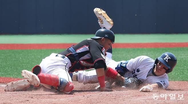 | 경남고 ‘통한의 주루사’ 경남고 박보승(오른쪽)이 12일 서울 양천구 신월야구장에서 열린 제79회 황금사자기 전국고교야구대회 겸 주말리그 왕중왕전 16강전 9회초 2사 후 홈에서 물금고 포수 윤지유에게 태그아웃당하고 있다. 박보승은 우익선상으로 빠지는 3루타를 친 뒤 상대 야수진의 연결 플레이 때 홈을 파고들었으나 주루사하고 말았다. 물금고는 6-5 한 점 차 리드를 지켜내며 2015년 창단 후 처음으로 황금사자기 8강에 올랐다. 신원건 기자 laputa@donga.com |