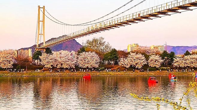 특히 물 위를 바라보면 오리배가 천천히 지나가는 모습이 보이는데, 그 장면이 유난히 여유롭게 느껴집니다. 꽃잎이 강 위에 떨어지는 순간까지도 하나의 풍경이 되니까요.