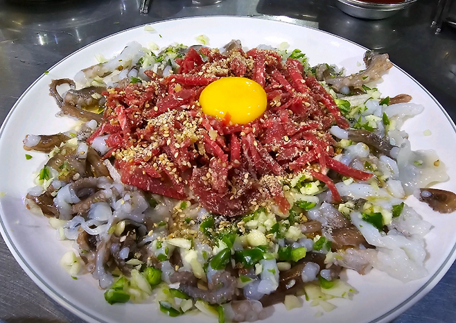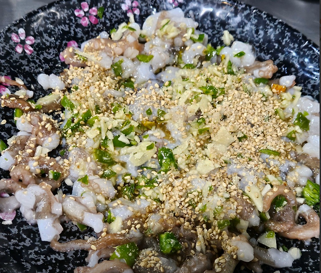 ▶ 산낙지초무침(45,000원): 새콤하고 시원한 양념으로 낙지 본연의 탱글한 식감을 살린 인기 메뉴.