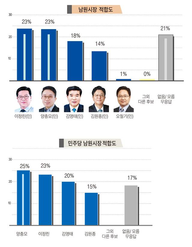 전북일보와 JTV전주방송, 전라일보가 공동으로 케이스탯리서치에 의뢰해 지난 18일부터 19일까지 실시한 '제9회 전국동시지방선거 남원시장 후보 적합도' 조사 결과에 따르면 이정린 전북도의원과 양충모 전 청장이 각각 23%의 지지율을 나란히 기록했다.