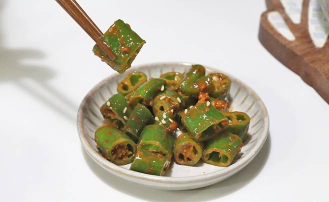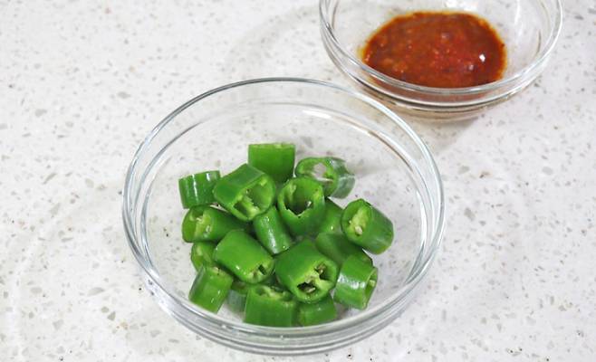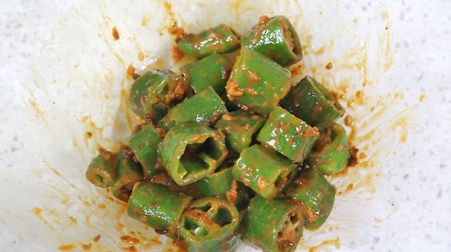양념이 잘 스며들게 하려면 먼저 고추의 수분을 잡아줘야 하는데요, 씻은 고추는 꼭 물기를 완전히 털어낸 뒤, 키친타월로 한번 더 닦아주세요. 시간이 된다면 상온에서 10분 정도 말려두는 것도 좋아요. 고추 표면이 살짝 건조해질 때 양념이 훨씬 잘 붙어요.