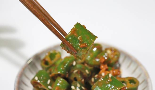 썰어놓은 아삭이 고추에 양념장을 넣고 골고루 섞어 줍니다. 마지막으로 참기름을 몇 방울 둘러주면 윤기가 살아나고 양념이 고추에 착 달라붙어요. 오이고추 안쪽까지 양념이 잘 스며들도록 밀어주면 양념이 겉돌지 않고 맛있게 먹을 수 있어요. 다 만들고 난 뒤에는 냉장고에 10분 정도 넣어두었다가 먹으면 더 맛있답니다.