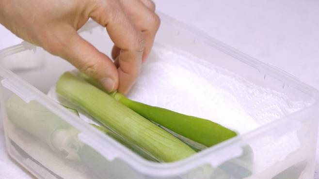 키친타월 말아 보관하기: 대파를 키친타월에 돌돌 말아 비닐봉지에 넣으면 수분을 조절해 신선도 유지