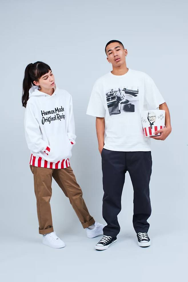 그런데 패션 기업인 휴먼 메이드가 왜 KFC와 콜라보를 하게 됐을까요? 추측해보자면 이렇습니다. 일본에는 크리스마스에 KFC 치킨을 먹는 문화가 있습니다. 이는 1974년 일본 KFC가 크리스마스 치킨 세트를 판매하면서 전개한 ‘켄터키 크리스마스’라는 마케팅 캠페인의 영향이 큰데요. 그 시기에 유년기를 보낸 니고도 KFC에 대한 향수를 가지고 있습니다. 그 기억이 이렇게 색다른 콜라보로 이어진 것 아닐까요?