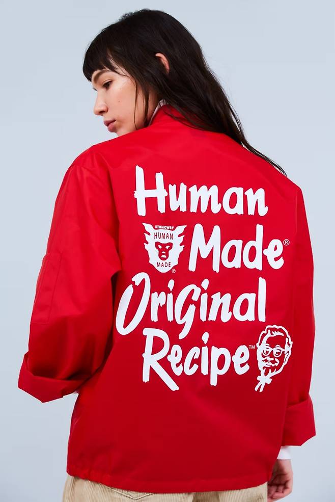 한 눈에 KFC와 휴먼 메이드의 콜라보라는 게 느껴지죠? 후디, 토트백, 재킷 등에 KFC의 시그니처인 흰색과 빨간색 스트라이프 포인트, 그리고 휴먼 메이드의 특징인 볼드한 레터링과 캐릭터 그래픽을 더했습니다.