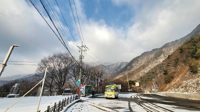 서대전역에서 택시로 5천원 정도 나오는 서부터미널에서 출발하는 34번 버스를 타면 종점에서 종점까지 가는 대장정입니다. 시내버스이기는 한데 대전에서 전북까지 가는 셈입니다. 배차간격이 45분 정도라 시간을 잘 맞춰야합니다. 완주 대둔산이라는 표지가 보이는 종점입니다. 여기서 30분 정도 걸어야 대둔산 들머리입니다. 진짜 멀죠?