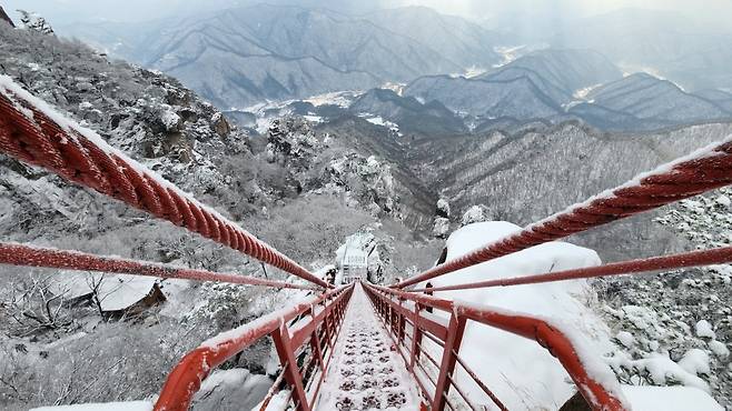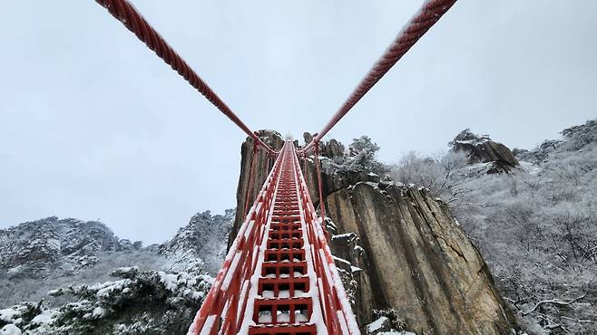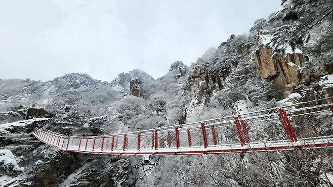 케이블카에서 내리면 역 20분을 걸어 금강구름다리를 만납니다. 빨강 다리가 흰 눈과 절묘한 조화입니다. 우리나라 구름다리의 원조라고 합니다.