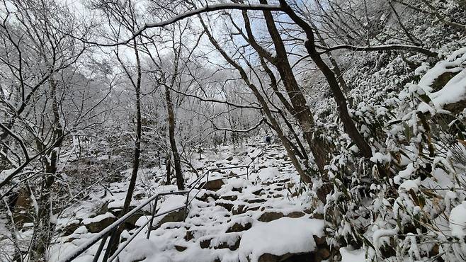 가장 힘든 돌길입니다. 눈이 내려 조심해서 오릅니다.