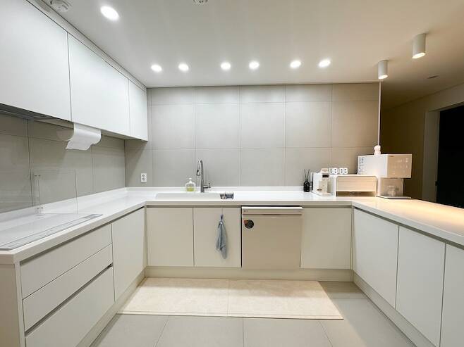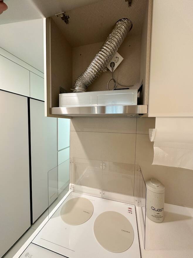 인덕션까지 화이트로 올 통일 -인덕션 위로는 유일하게 상부장이 있는데 저긴 주방 후드가 숨어있어요! 예전에 하츠 주방 후드를 사용해 봤는데,, 시간이 지나니 겉면에도 기름때가 생겨 끈적해지더라구요ㅠ 너무 멋지고 좋은데,, 예쁨보단 청소가 조금 더 우선인 저는 이번엔 기본 후드로 가기로 했습니다.