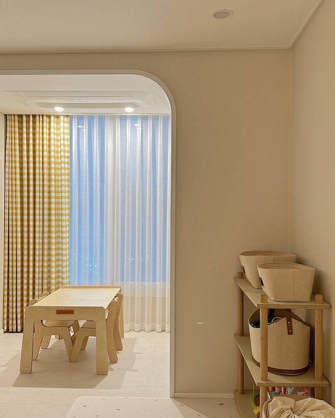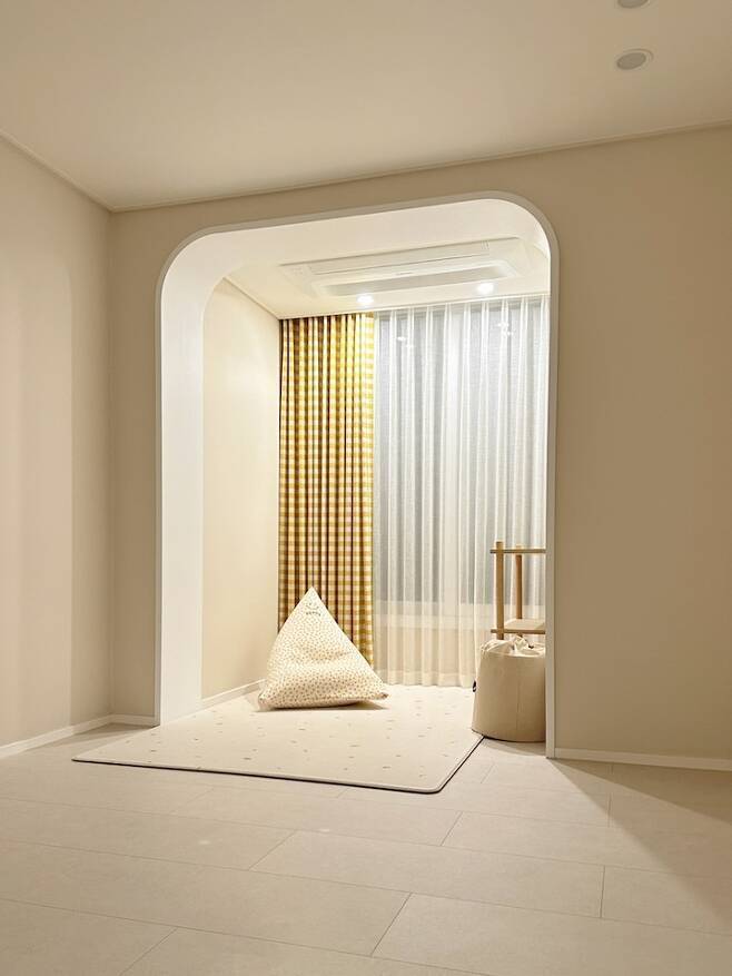 아치는 유행을 많이 탈 거 같아서 스퀘어 아치로 작업을 요청했어요. 너무너무 만족스러운 작업이에요...ㅠㅠ 놀러 오시는 분들 모두 아이방이 너무 귀엽고 예쁘다고 칭찬해 주시는데 그때마다 엄마는 뿌듯해 죽습니다.. 노란 체크 커튼까지 귀여운 노란색으로 골라봤어요.